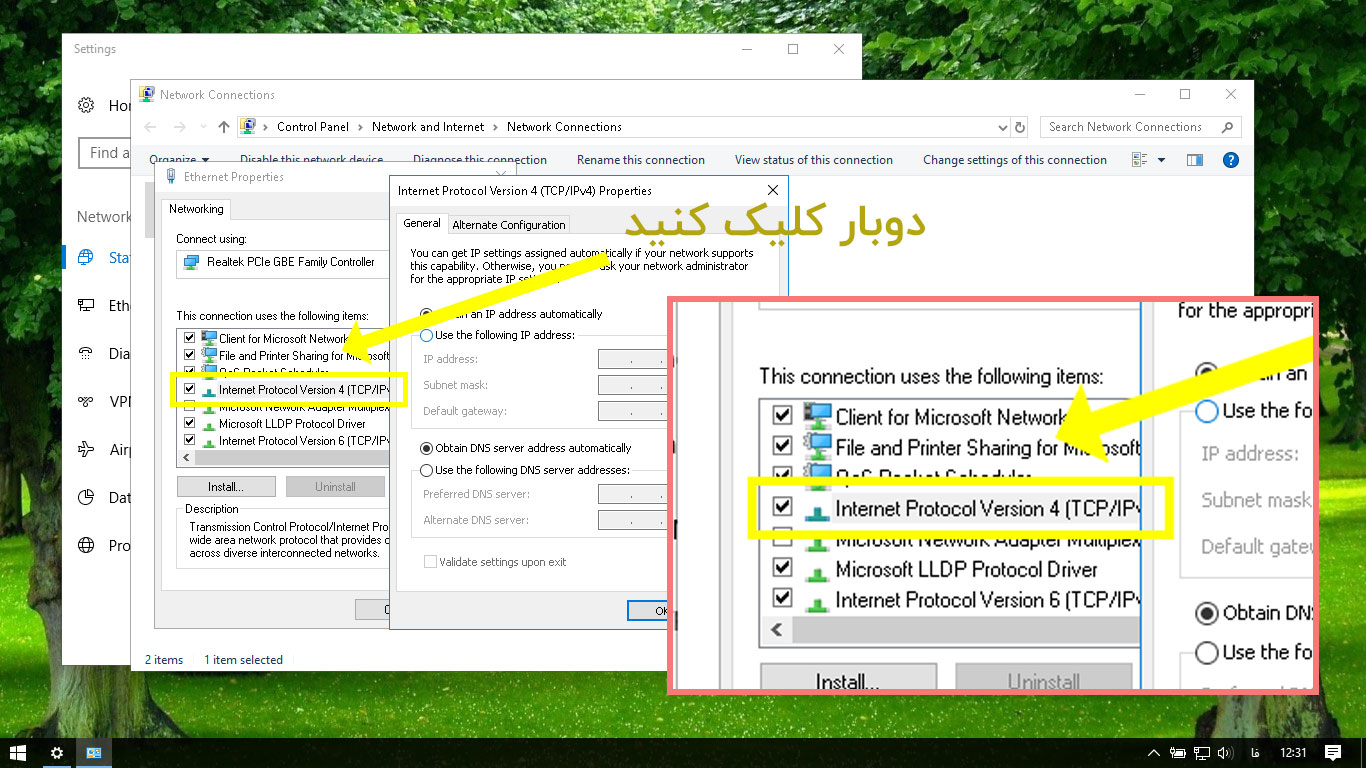 توجه کنید زمانی که میخواهید به آی پی آدرس یه دوربین وصل شید باید آدرس آی پی کارت شبکتون رو با اون هم رنج کنید در زیر نحوه تغییر آی پی رو مشاهده میکنید