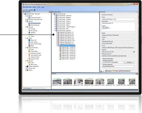 - مناسب برای عملیات نظارتی در مقیاس بزرگ و مکانهای پراکنده : پشتیبانی از تعداد نامحدودی از دوربینها و کاربران و سایتها از ویژگی های بارز Corporate میباشد . این نرم افزار یک سیستم مدیریت مرکزی را برای تمام دوربینها و ابزار متصل به آنها را ، بدون توجه به سایز سیستم و پراکندگی آنها ، فراهم میکند . XProtect Corporate میتواند به تمام محصولات مایلستون متصل شده و یک مدیریت مرکزی را برای آنها ، با وجود پراکندگی مکانی ، فراهم آورد .