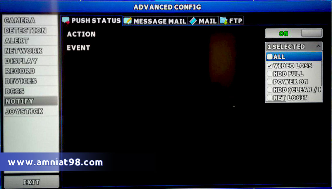 در قسمت Event باید حالت video loss رو فعال کنید یعنی قطع شدن تصویر.